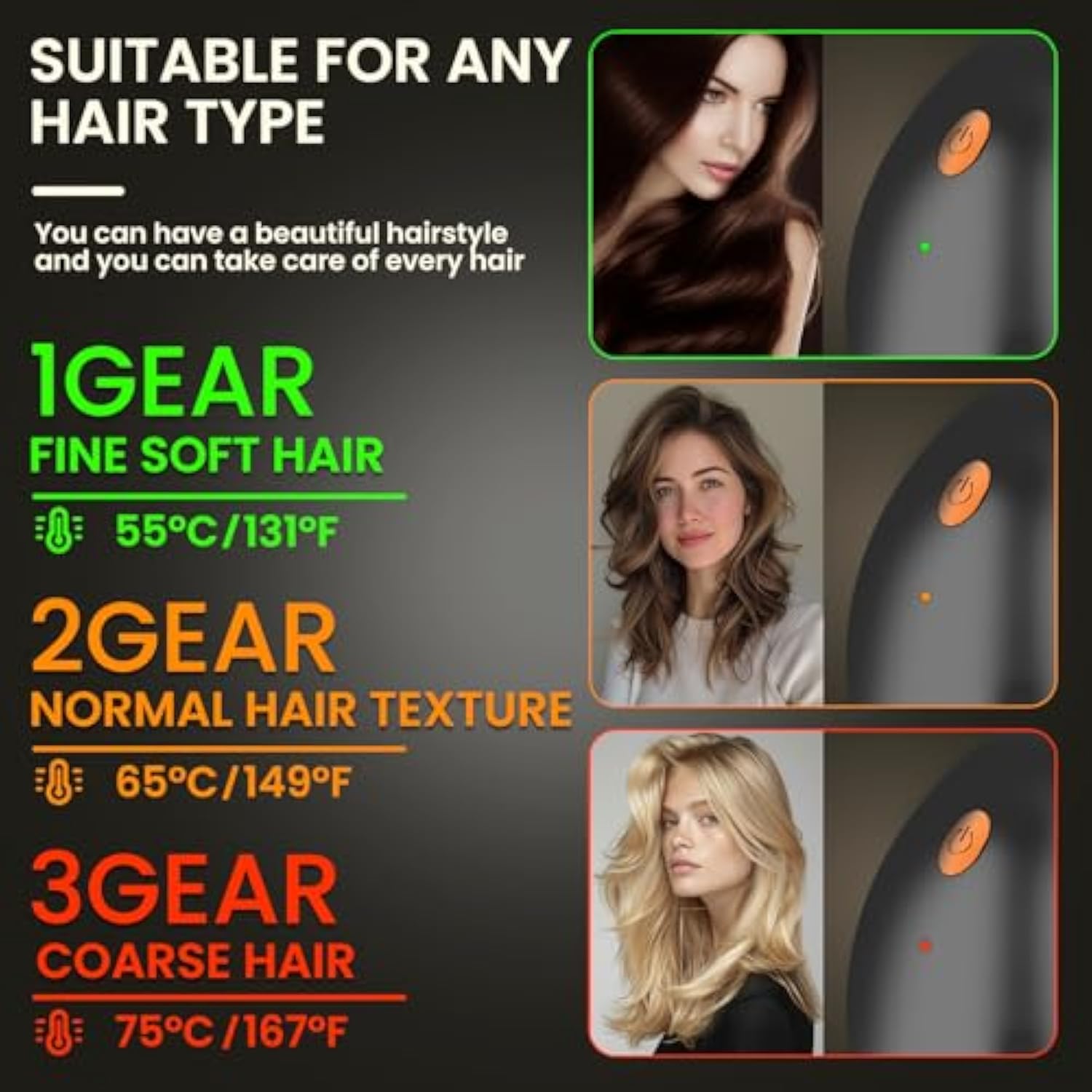 - 3-Speed Temperature:Adopting Dual insulation module, it can heat up to the highest temperature within 20 seconds. Three temperature: 160 ℃/320 ° F, 180 ℃/356 ° F, 200 ℃/392 ° F, separately suitable for fine soft, ordinary, and coarse hard hair. LCD display screen to clearly display the usage of the current temperature battery, and 360 degree anti-scald design for your hair care
